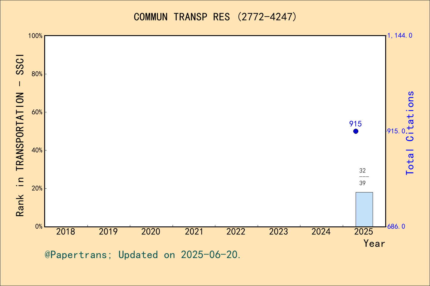 根據(jù)影響因子官網(wǎng)(https://impactfactor.cn/),COMMUNICATIONS IN TRANSPORTATION RESEARCH 期刊在2021年創(chuàng)刊,2024年時(shí)間被ESCI-運(yùn)輸,ESCI-交通科技,SCIE-交通科技,SSCI-運(yùn)輸,中科院升級(jí)版(大類(lèi))-工程技術(shù),中科院升級(jí)版(小類(lèi))-運(yùn)輸科技,中科院升級(jí)版(小類(lèi))-交通運(yùn)輸,ScienceDirect(大類(lèi))-社會(huì)科學(xué),ScienceDirect(大類(lèi))-物理科學(xué),ScienceDirect(小類(lèi))-決策科學(xué),ScienceDirect(小類(lèi))-工程,ScienceDirect(小類(lèi))-社會(huì)科學(xué)等多個(gè)數(shù)據(jù)庫(kù)收錄,首年2024年影響因子12.5,最新2025年影響因子14.5,2025年獲中科院期刊分區(qū)為工程技術(shù)大類(lèi)1區(qū)Top期刊,在數(shù)據(jù)庫(kù)SSCI(社會(huì)科學(xué)索引), 專業(yè)方向: TRANSPORTATION(運(yùn)輸),期刊總數(shù):39中排名中蟬聯(lián)第一。在數(shù)據(jù)庫(kù)SCIE(自然科學(xué)索引擴(kuò)展版), 專業(yè)方向: TRANSPORTATION SCIENCE & TECHNOLOGY(交通科技),期刊總數(shù):42中排名第二位。 連續(xù)兩年在 “TRANSPORTATION” 領(lǐng)域排名第1和 “TRANSPORTATION SCIENCE & TECHNOLOGY”排名第3。期刊COMMUN TRANSP RES歷年影響因子及學(xué)科(SSCI-運(yùn)輸)排名 期刊COMMUN TRANSP RES歷年影響因子及學(xué)科(SCIE-交通科技)排名 期刊COMMUN TRANSP RES總引頻次@學(xué)科(SSCI-運(yùn)輸)排名 期刊COMMUN TRANSP RES總引頻次@學(xué)科(SCIE-交通科技)排名 首個(gè)中科院期刊分區(qū)即為工程技術(shù)大類(lèi)1區(qū)Top期刊!